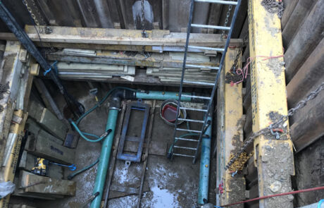 The installation called for construction of a six-metre deep manhole and a 23-metre timber heading out under Battersea Park Road to connect a 300mm pipe with Thames Water (TW) sewer Lower Level 1 (LL1).