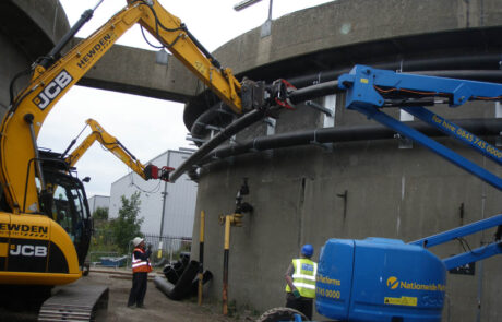 Electrofusion bends and couplings were installed at high level to join each of the individual strings. Work at height risks were managed using a combination of MEWP’s, traditional scaffolding, PASMA towers and man riding baskets to suit each work location.