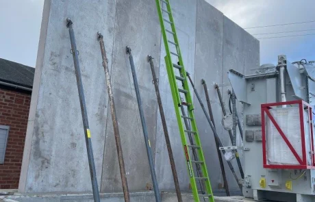 We procured and managed the installation of a 6.5m high precast wall to seprate the existing switch-room from the new transformer. This was facilitated with the planned isolation of existing 11Kva overhead cables, obtaining a crane permit and serving a road opening notice via liaison with Suffolk Highways.