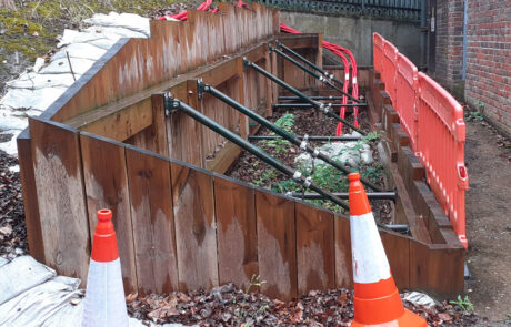 Falco consulted with permanent and temporary works designers and used a risk-based methodology which allowed the existing temporary works to be removed in two metre sections while the new gabion basket profile was installed.