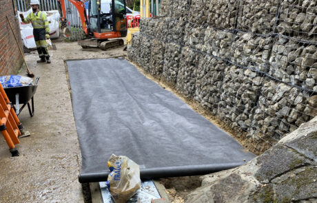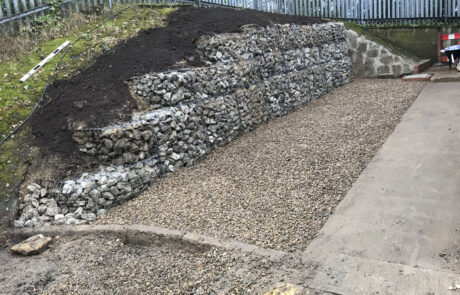 The site was congested and adjacent to a very busy road with limited footprint for parking or storage. Due to the lack of space deliveries were micro-manged by our Site Manager. The gabion stone was delivered to site in 10-tonne consignments and wastes were removed to a local materials recycling facility by a licenced haulier using a mobile grab lorry on an on-demand basis.
