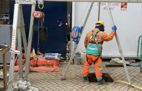 A Section 106 Consent to connect to the Thames Water sewer had been obtained by the clients’ civil engineering designer. As part of our construction phase duties, we engaged with Thames Water operational teams to obtain the necessary safety permits. During our initial discussions two practical issues quickly emerged: When our confined spaces sewer survey team carried out the man-entry condition survey of the receiving Thames Water sewer we found substantial fibre-optic telecoms cables installed in the sewer clashing with the proposed new connection point. A diversion of which would entail significant time /cost implications. Also, the receiving sewer was confirmed to be a trunk sewer and Thames Water do not permit direct connections to trunk sewers as a matter of policy.
